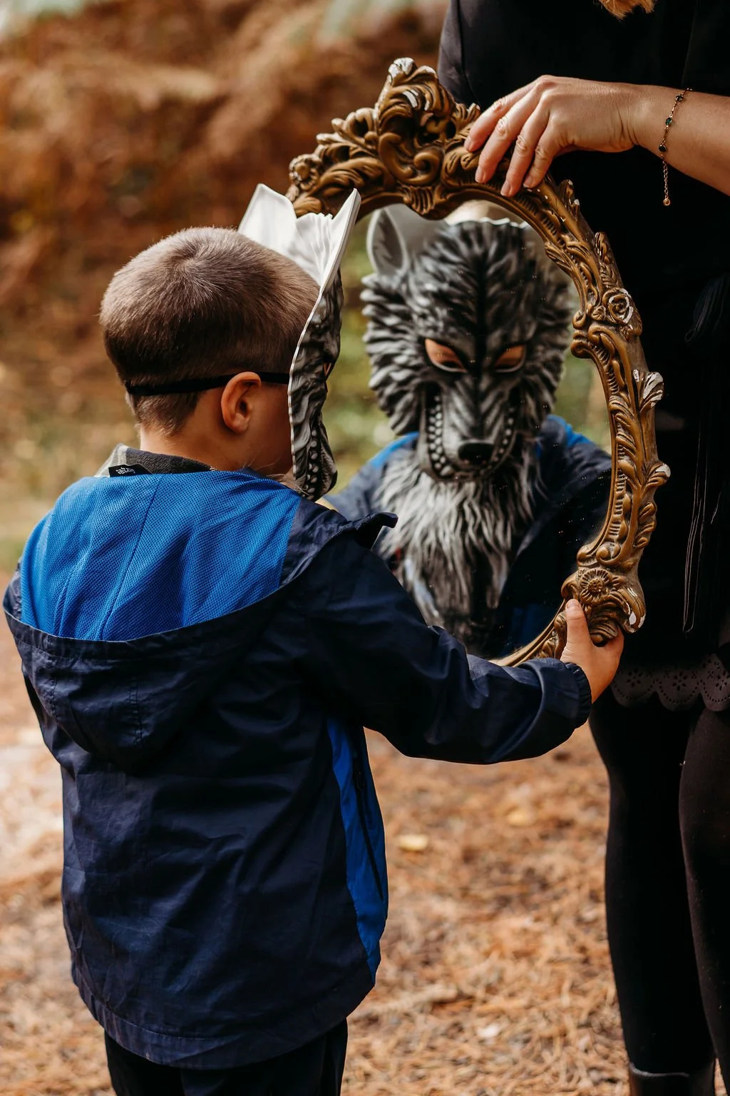 We began with gentle, low-key portraits to warm everyone up, sitting together on a blanket under the pines, eating toffee apples. We then moved into exploring the woods with prompt-led play: who can float their cape the highest, who can you see in the mirror. These simple games bring out natural expressions and keep little ones engaged.